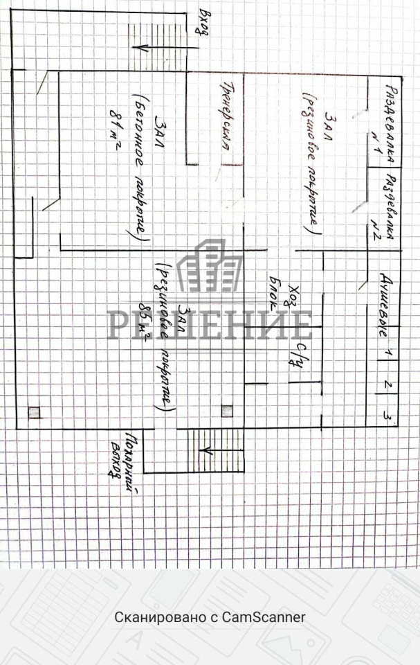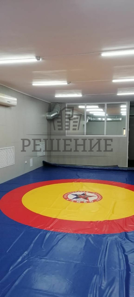 Три просторных зала 81 м2, 85м2, 33м2. Во всех залах резиновое покрытие. Высота потолка 3,5 м. В каждом зале работает вентиляция (принудительная / самоток). Тренерская, две раздевалки, душевые, санитарные узлы, хоз. блок, запасной выход.